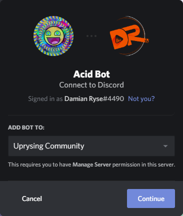 - Select the server you wish Acid Bot to connect to and click on continue.